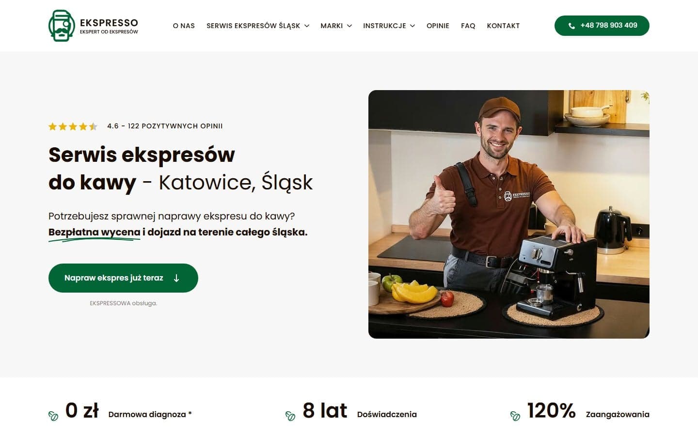Serwis ekspresów do kawy to nisza gdzie klient jest w trybie "akcja" — coś się zepsuło, chcę szybko naprawić, nie chcę rozmawiać z firmą która nie zna się na rzeczy. Strona Ekspresso komunikuje konkret: doświadczenie 8 lat, opinie 4.6/5.0, obsługa wszystkich marek, bezpłatna diagnostyka. Nie ma tu miejsca na ogólniki — są fakty które budują zaufanie w 10 sekund.