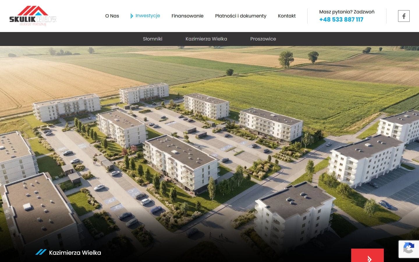 Skulik Deweloper dostał stronę która oddaje 20 lat doświadczenia i stabilność firmy. Klient szukający mieszkania w regionie Słomnik, Proszowic lub Kazimierzy Wielkiej trafia tu, widzi portfolio, widzi proces zakupu, widzi opcje finansowania — decyduje.